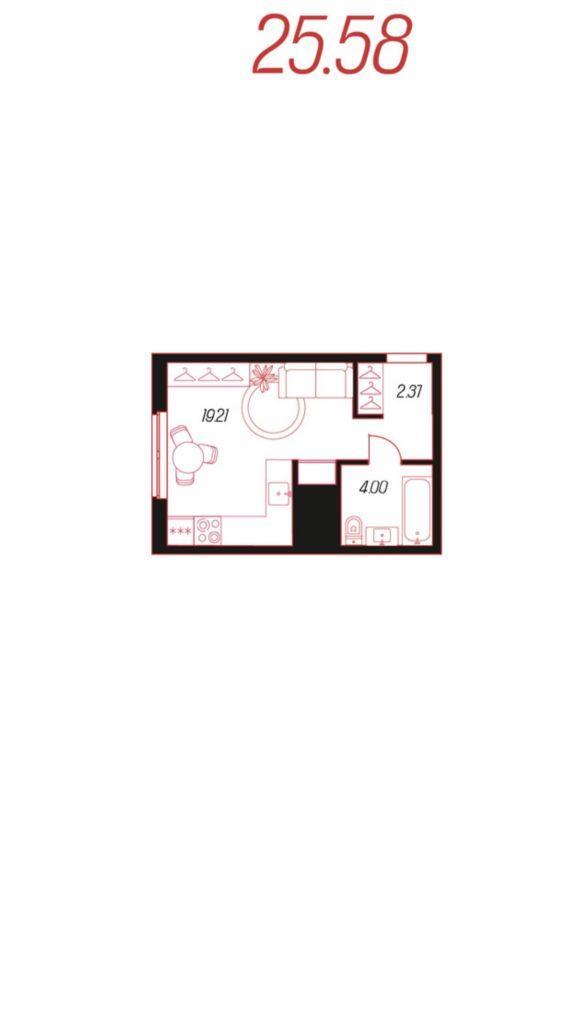 - Общий метраж 25,58 кв м;